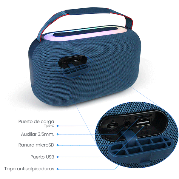 Duración de uso: Disfruta de entre 3 a 5 horas continuas, dependiendo del volumen, el contenido y el uso de luces RGB.