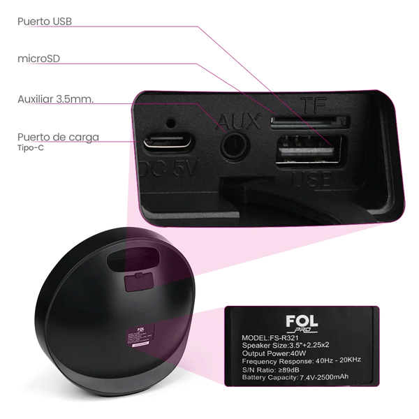 Conectividad: Bluetooth / USB / microSD / Aux 3.5 mm / Radio FM